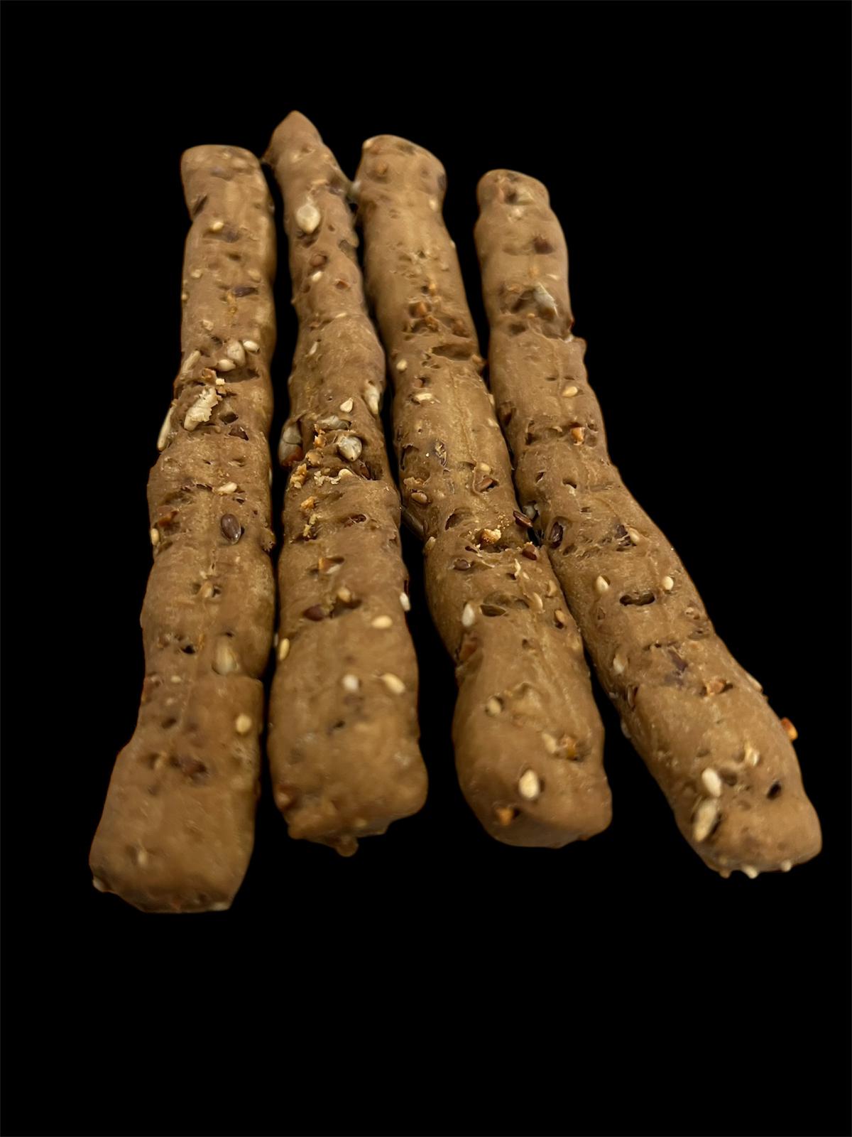 Grissini  multicereali con semi di sesamo lino e soia. Con l’aggiunta di farina di grano duro e malto d’orzo.